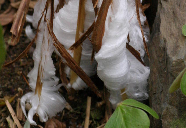 上の写真を拡大したものです。 氷が糸状に巻くようにでています。 |
